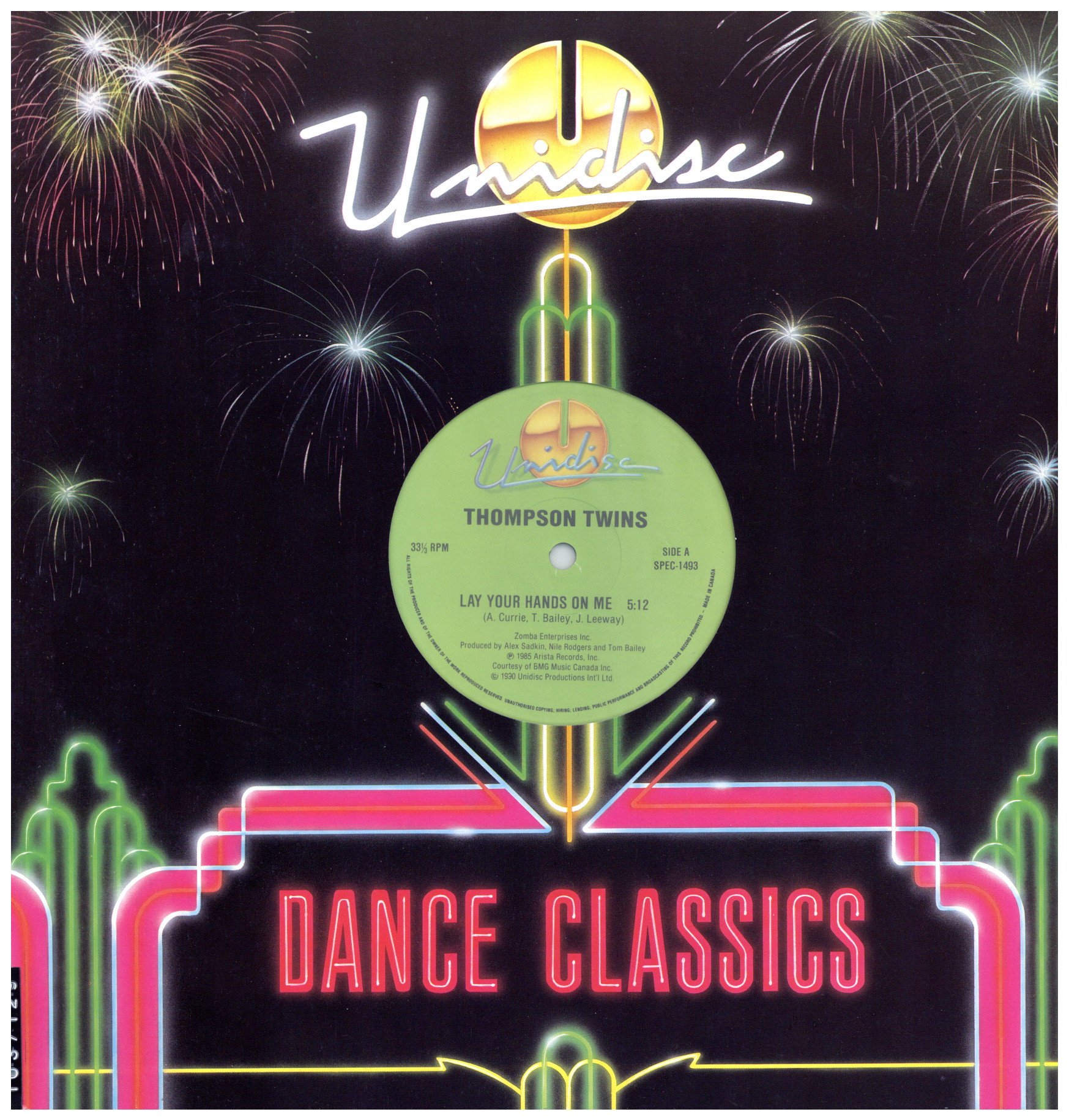 Unidiscカンパニースリーブ・BPMシール貼ってます。カナダのUnidiscからの再発シリーズ。80年代を席巻したニュー・ウェイヴ・バンドThompson Twinsが’84にリリースした代表作”Lay Your Hands On Me”、UKのマッドサイエンサーThomas Dolbyの代表作でMobb Deep”Got It Twisted”の元ネタでもある”She Blinded Me With Science”を収録したダブルAサイダー盤です。
