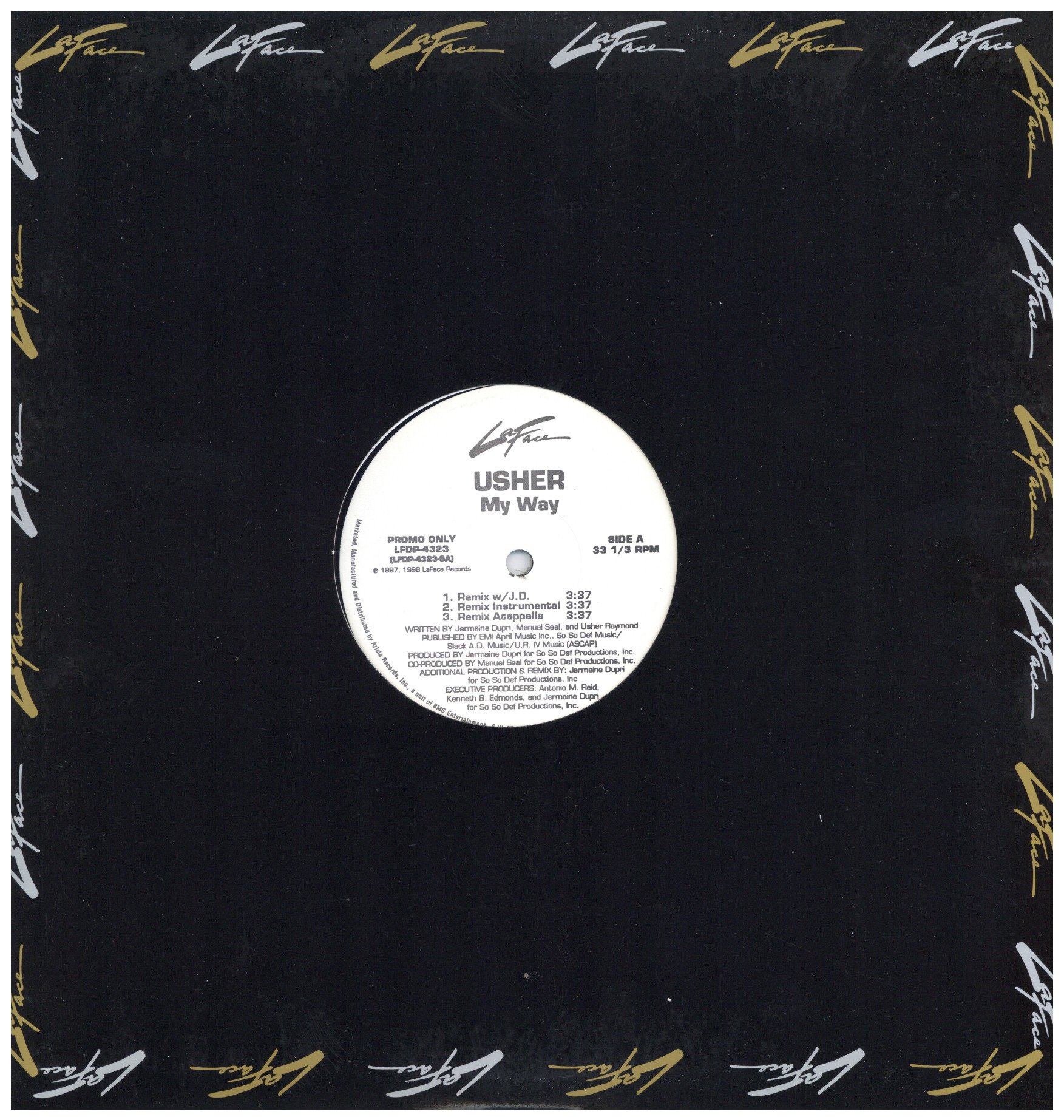 未使用盤・LaFace Recordsカンパニースリーブ。US Org。全米を代表する男性ボーカリストが’97にリリースした2ndアルバム”My Way”からのタイトルカット。Jermaine DupriとManuel Sealの共同製作によるミッドバウンスのAlbum Version、Jermaine Dupriが手掛け自身も参加しトラックも差し替えたRemixを収録。