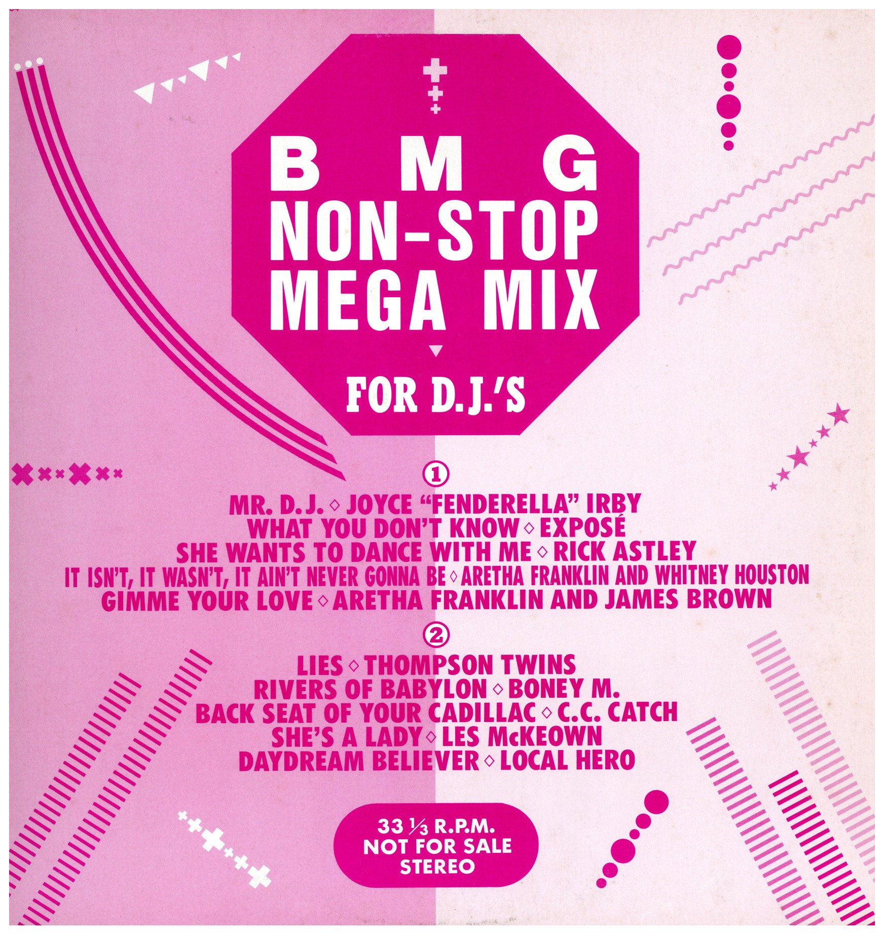 見本盤・ライナーノーツ付。日本企画見本盤。’89にリリースされたBMG音源をNon StopでMixしたサンプラーコンピアルバム。Joyce Irby”Mr. D.J.”から”Sir Duke”、”ABC”、”Upside Down”等のフレーズを挟み、Expose”What You Don’t Know”へ繋がるA面や、Thompson Twins”Lies”から、Bonny M”Gotta Go Home”のキラーコーラスを挟み同じくBoney M.”Rivers Of Babylon”へ繋がるB面までジャンルを超えてノンストップでお楽しみいただけるでしょう。