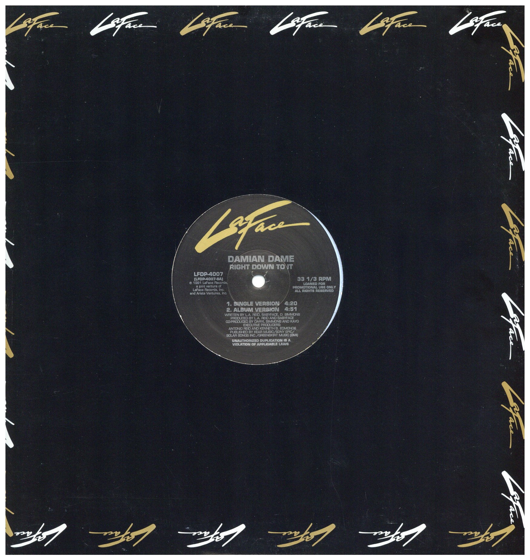 LaFaceカンパニースリーブ。US Promo Org。LaFace Recordsの最初に契約したアーティストである男女Duoが’91にリリースした唯一のアルバム”Damian Dame”からのシングルカット。もちろん製作はL.A. Reid & Babyfaceで派手なアップチューンではありませんが、甘~いメロウJam仕上げですが、そこは当時のLaFaceならではの軽く心地よく跳ねてくれる名曲です。LaFace Records初期のプロモ盤なのでかなりプレスが少ないようでレアです。