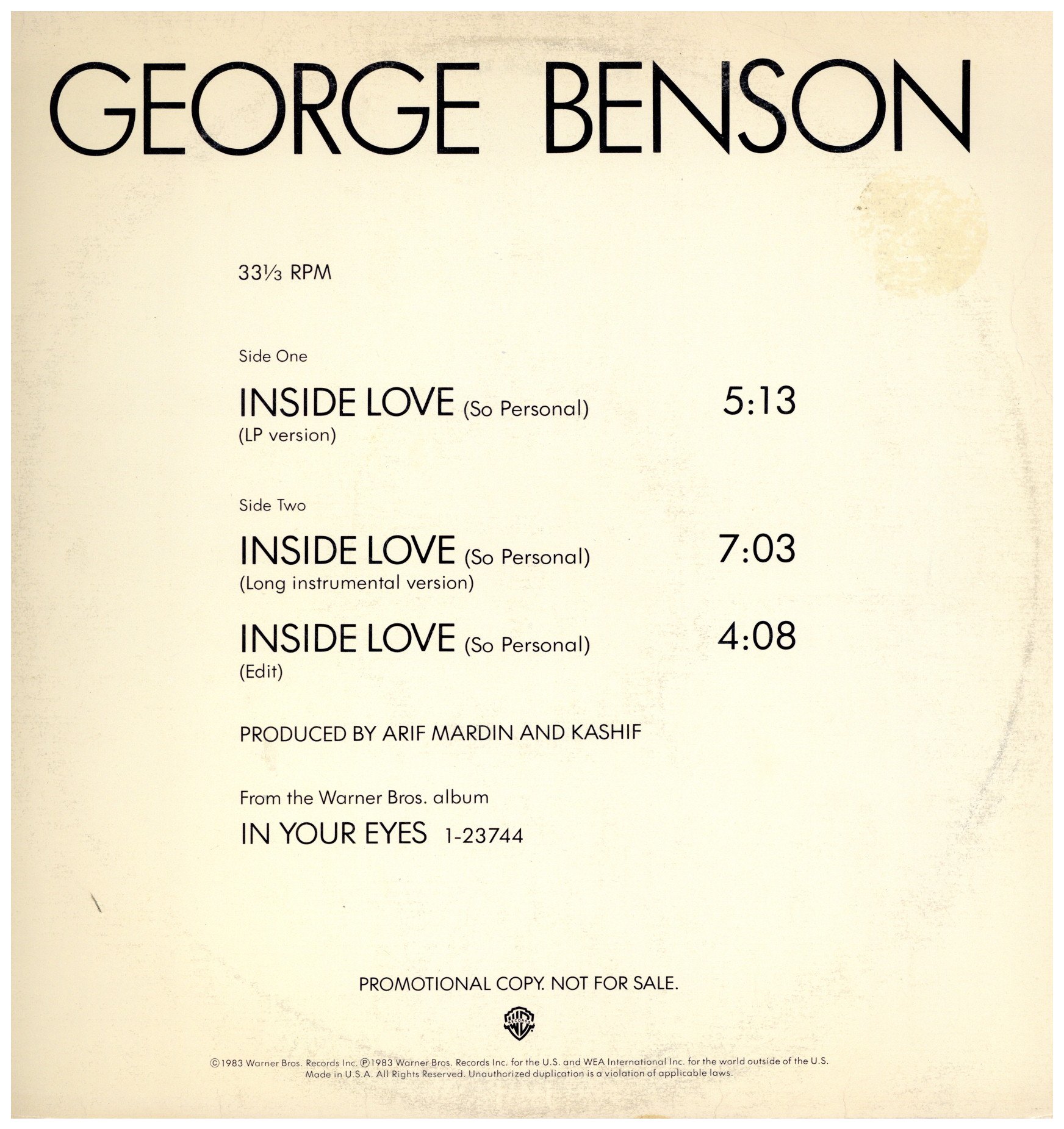 Warner Brosカンパニー透明スリーブ付。US Org。人気ギター奏者ながらも80年代はブラコン・ボーカリストとしても人気を博した彼が’83にリリースしたアルバム”In Your Eyes”からのシングルカット。Kashif製作で”Give Me The Night”を彷彿させるイントロのギターリフの心地良さが抜群の人気チューンです。