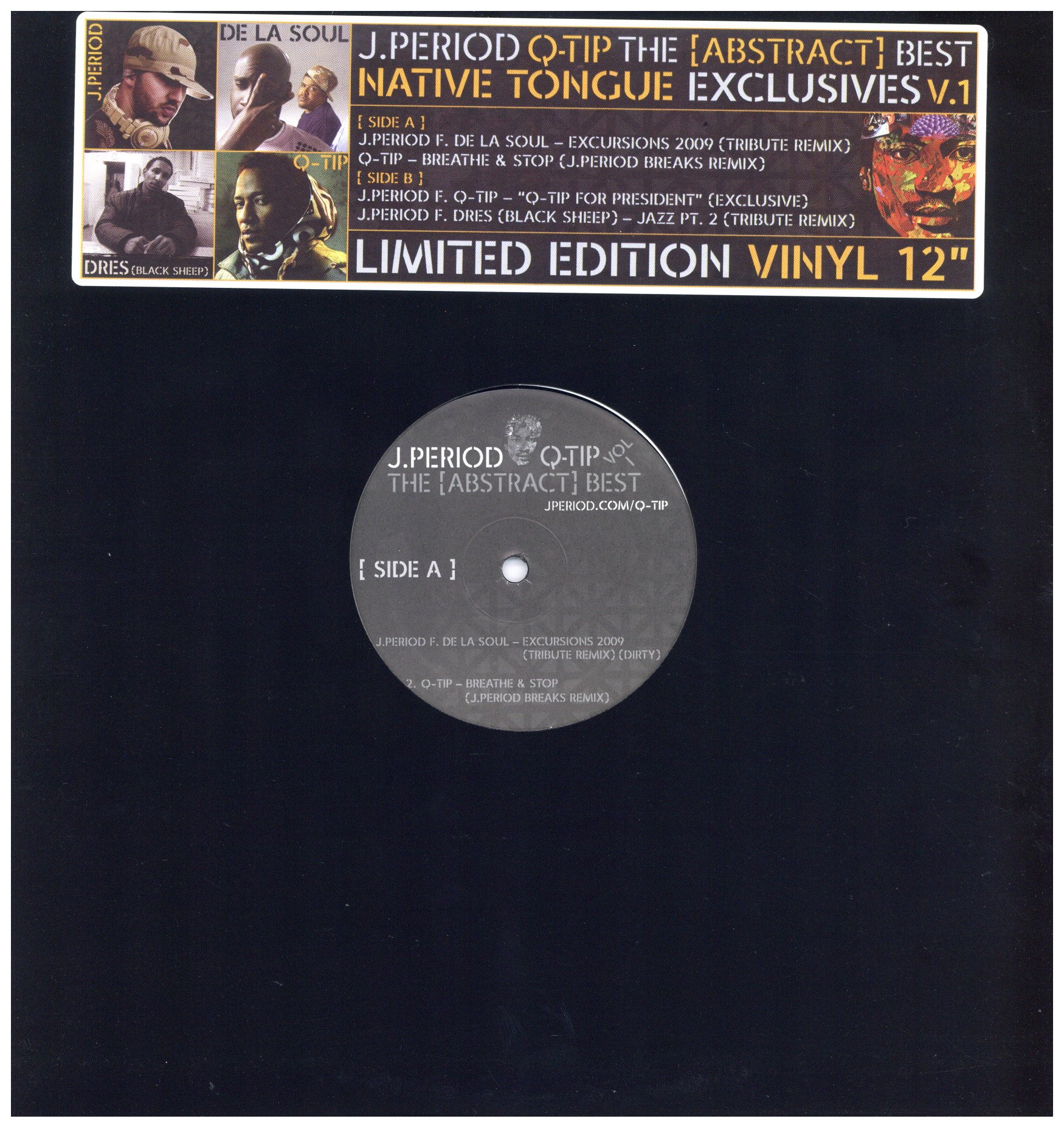 ジャケステッカー有。Brooklynの人気DJ J.PeriodがQ-Tipをホストに迎えた話題作J.Period Presents The Abstract Q-Tipからの限定アナログ。伝説の2ndアルバムの先頭バッターを務めた、Art Blakey & The Jazz Messengers”A Chant For Bu”使いの黒いベースラインでお馴染みの”Excursions”、ネイティブ・タン・ポッセとして共にニュー・スクールの新時代を築いたDe La Sou(!!)をfeatした”Excursions Tribute Remix”、ソロデビュー作となった”Amplified”からのヒットシングル”Breathe & Stop”は、Minnie Riperton Inside My Love等、次々とトラックがスイッチする展開のJ.PeriodによるRemixが最高。そして’09米大統領選に合わせリリースされ、ネット上でも話題だったEric B. Is President使いの”Q-Tip For President”、Dres(of Black Sheep!!)を迎えて「ウィ~ガッタ ジャズ♪」でお馴染み”Jazz Pt.2″の全4曲を収録。