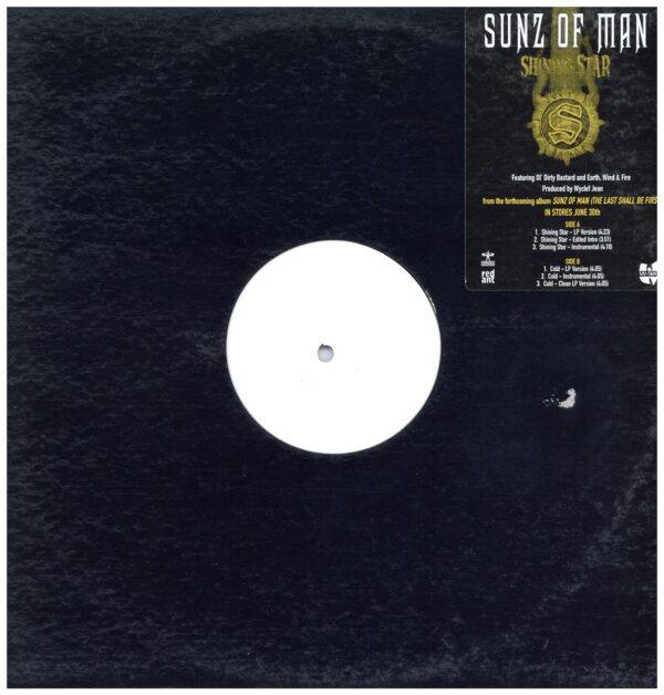 ジャケステッカー・破れ箇所有。スリ傷有るがプレイOK。’98リリース作。Wu-Tang一派でKillah Priest、Prodigal Sunn、Hell Razah、60 Second Assassin、そしてShabazz the Discipleによるグループが’98にリリースしたデビューアルバム”The Last Shall Be First”からのプロモオンリーシングル。製作はなんとWyclef Jeanで、EW&Fによる名曲”Shining Star”を使いその本家Earth, Wind & FireとOl’ Dirty Bastardを迎えた”Shining Star”、4th Disciple製作でJames Brown”Sunny”のイントロのピアノループを使ったWu印オケの”Cold”をカップリング。