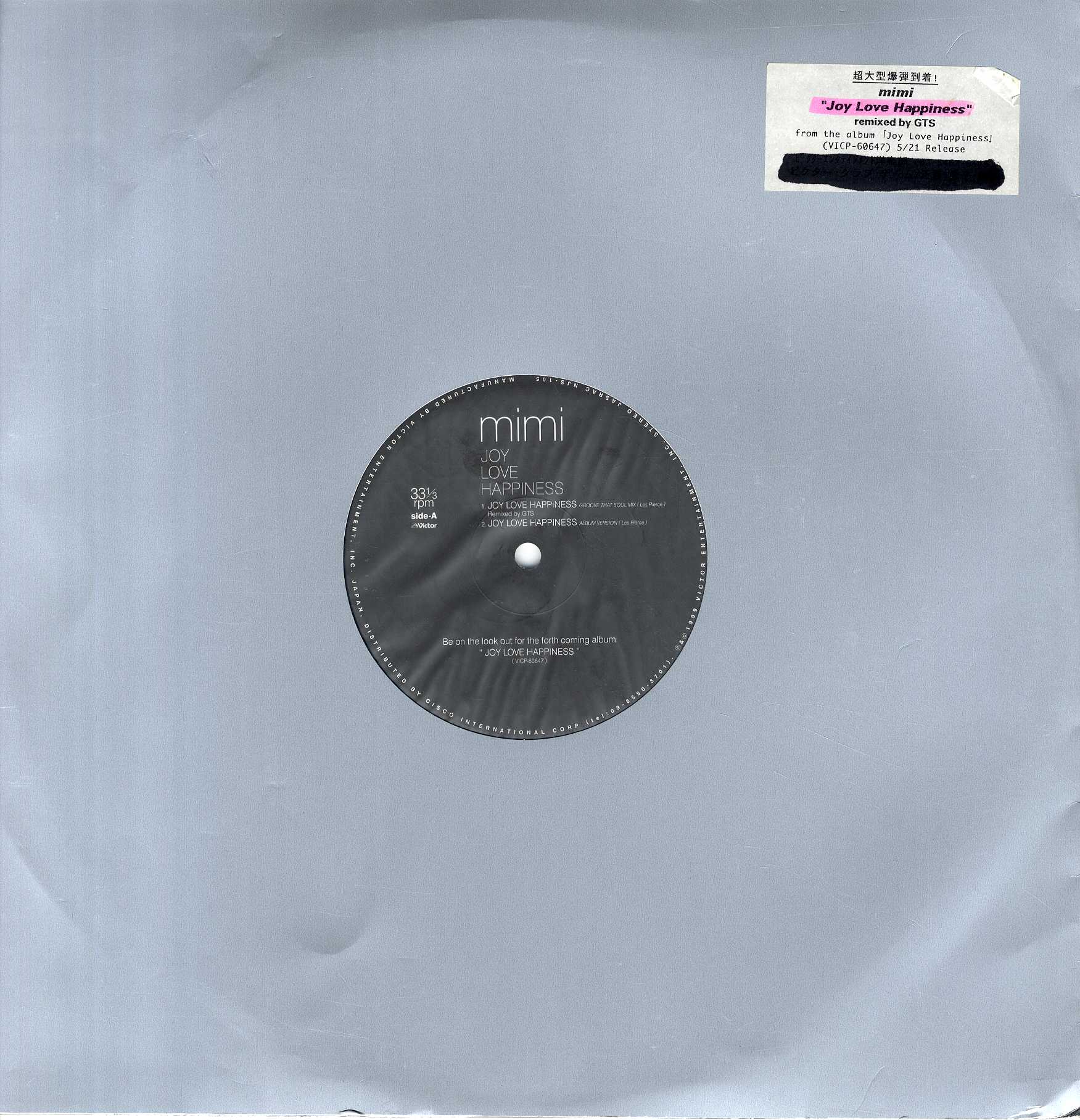 70年代からソウルディーヴァーとして活動を続けていた彼女が宮本典子が’99にMimiとして再デビューを果たした彼女がリリースしたアルバム”Joy Love Happiness”からのプロモシングルカット。リリース当時、数ヶ月に渡りクラブプレイチャートNo.1をキープしてイベントのピーク時を毎夜狂喜乱舞させていた大ヒットナンバー”Joy Love Happiness (Album Version)”、GTSが手掛けた”Joy Love Happiness (Groove That Soul Mix)”、人気ラッパーCoolioを迎えたメロウチューン”It’s All Right”を収録。