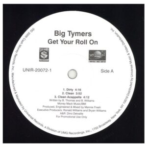 アーティスト BIG TYMERS タイトル GET YOUR ROLL ON (RE) 中古項目 中古レコード タイプ 12" 製造国 US リリース年 2004 レーベル Cash Money Records / Universal Records 品番 UNIR-20072-1 状態:盤質 NM (中古ですが良好です。) 状態:ジャケ 最新入荷日 2026/2/5 商品番号 147622 ¥1,250 -